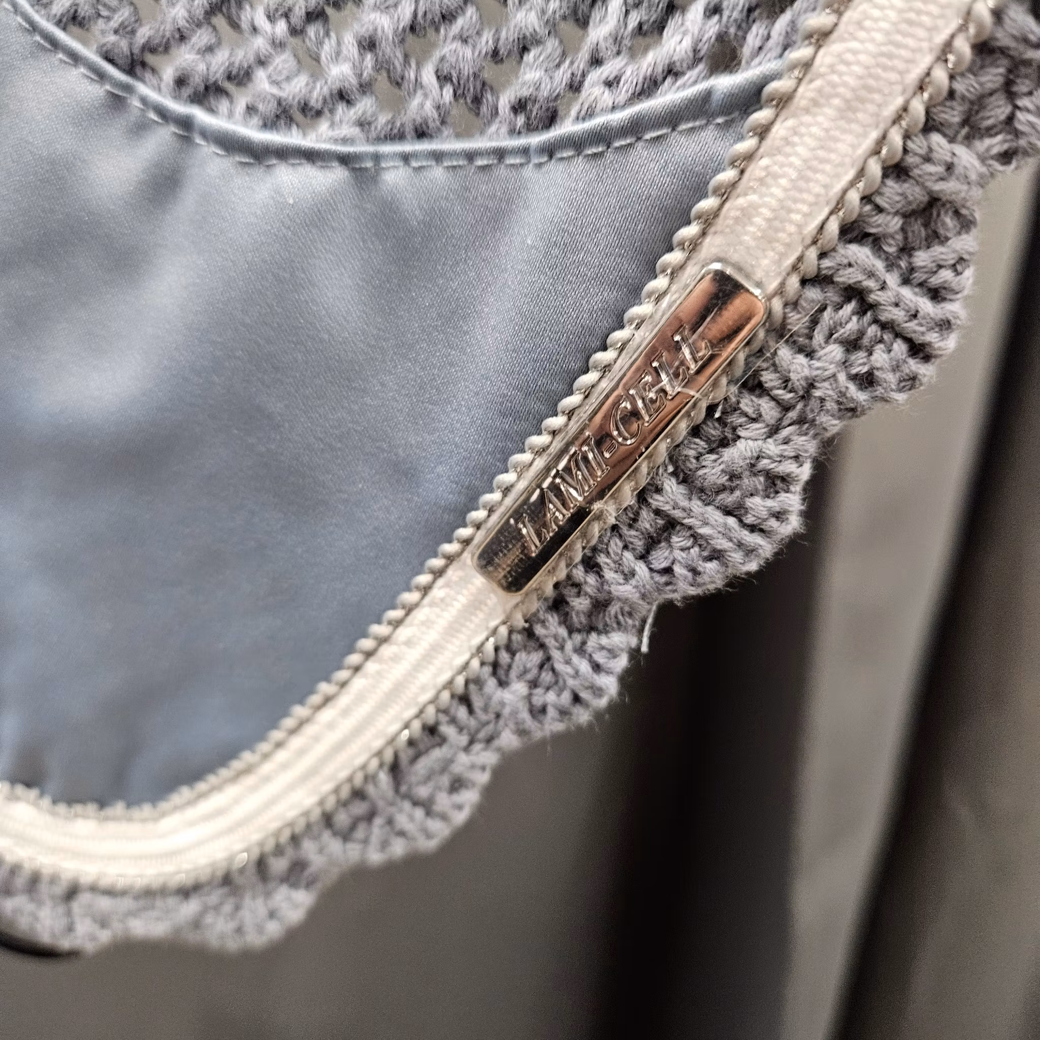 - Virkad bomullshuva med elastiska dekorband som har silver lurex-effekt och Lami-cell metall badge på vänster sida.
